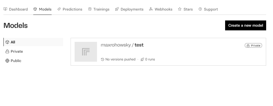 The final step is to deploy your model to Replicate. To do this, start by going to the models overview page and click on the "Create model" button: "Create a new model". Next, walk through the steps to create a new model.